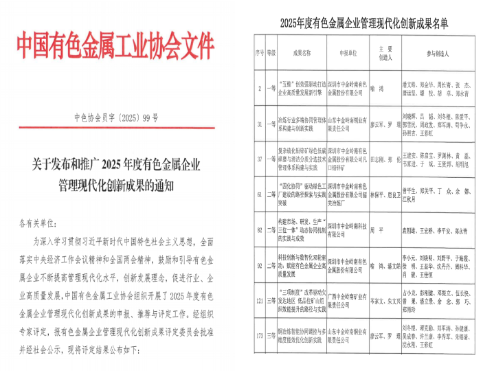 近日,2025年度有色金属企业管理现代化创新成果评选结果正式公布。广晟控股集团控股的上市公司中金岭南及其所属企业凭借多项卓越的管理创新实践,喜获8项大奖。其中,中金岭南《“五维”创效强驱动,打造企业高质量发展新引擎》、凡口铅锌矿《复杂硫化铅锌矿绿色低碳碎磨与清洁分质分选技术管理体系构建与实践》、中金铜业《冶炼行业多端协同管理体系构建与创新实践》三项成果荣获一等奖;韶关冶炼厂《“四化协同”驱动绿色工厂建设的路径探索与实践突破》、中金科技《构建市场、研发、生产“三位一体”动态协同机制的实践与成效》等三项成果荣获二等奖;广西矿业《“三项制度”改革驱动欠发达地区低品位矿山组织效能提升的路径与实践》等两项成果荣获三等奖北京正规的股票配资公司,充分展现了公司在全产业链协同创新方面的综合实力。